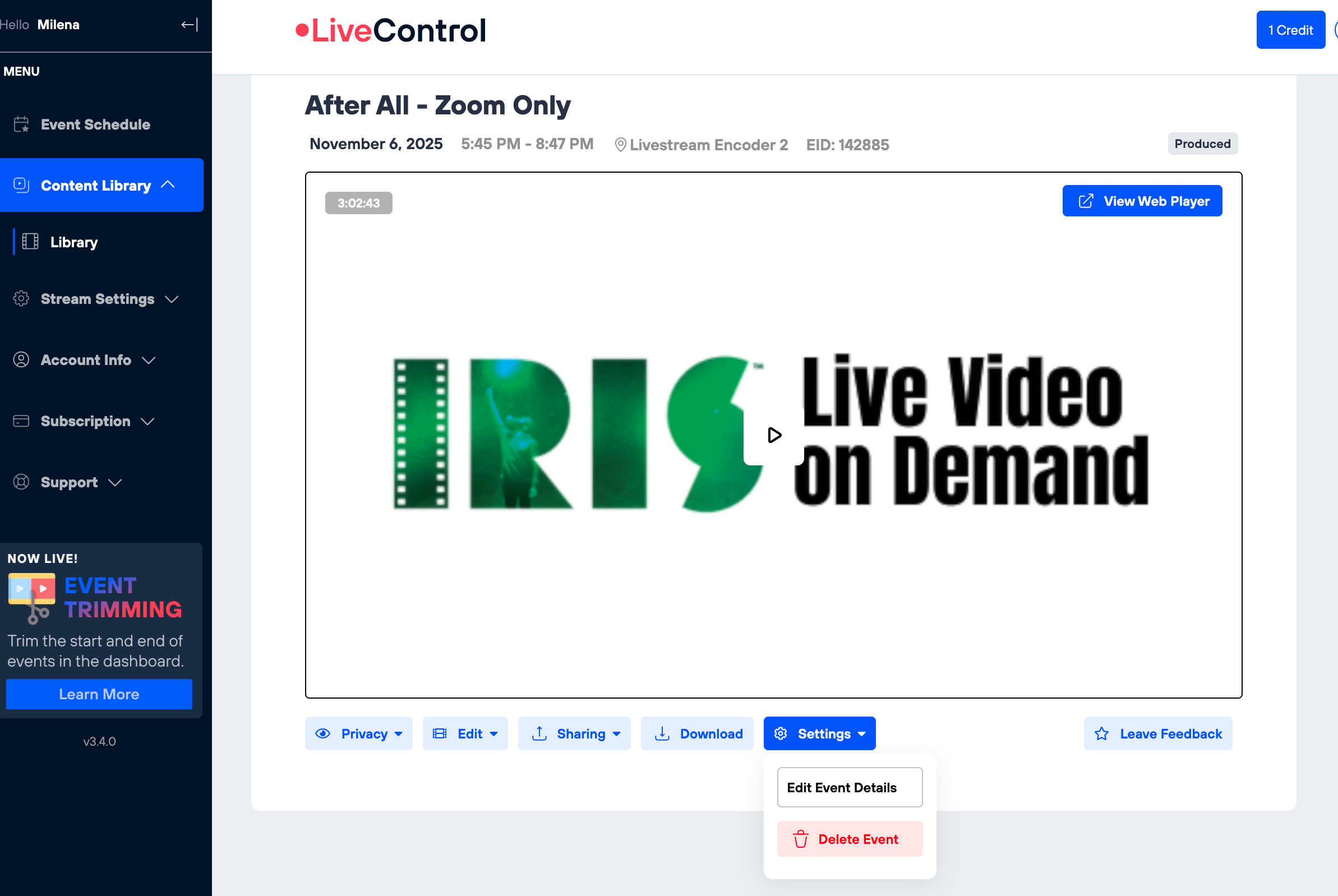 - Click Edit to change event details, or click on the appropriate menu.